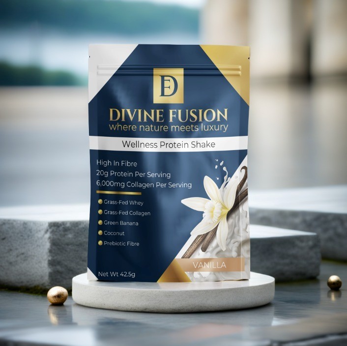 Experience the perfect fusion of luxury and nutrition with Divine Fusion Wellness Shakes – crafted with premium ingredients including grass-fed whey protein, grass fed collagen, prebiotics, and superfoods for a deliciously smooth, gut-friendly shake that supports muscle recovery, energy, and radiant health. Free from fillers, gums, artificial sweeteners, and GMOs, it’s clean, wholesome nutrition made easy – just mix and enjoy.
