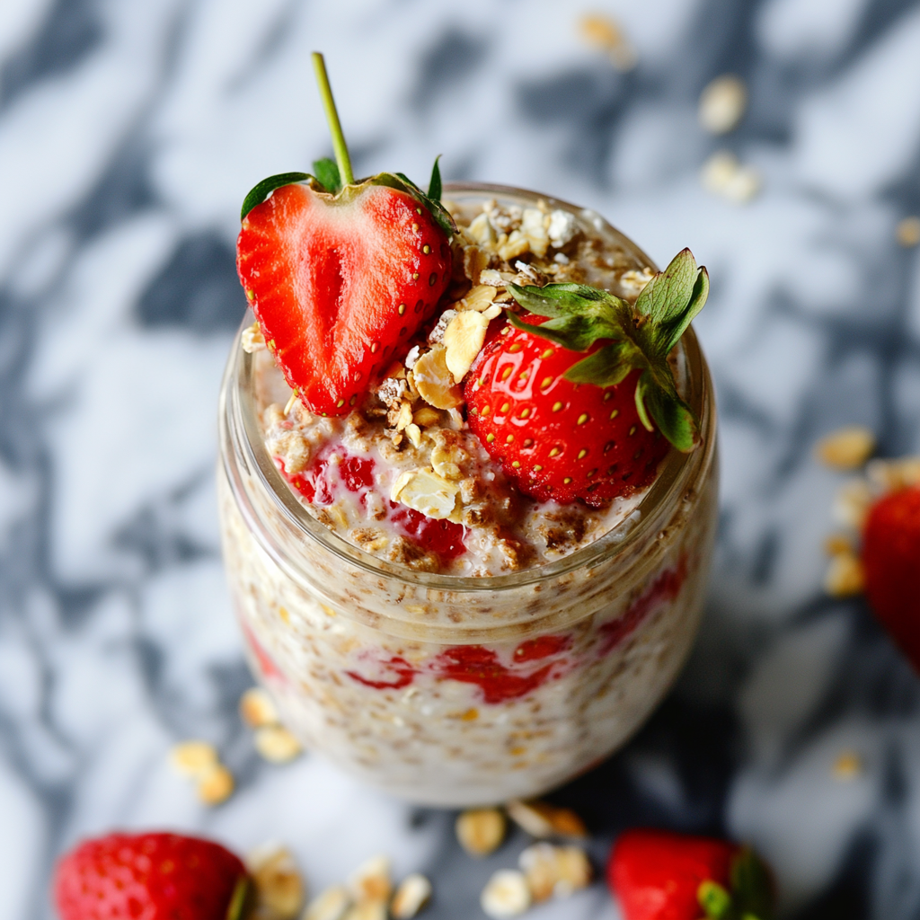 • When ready to eat, spoon your creamy oat mixture into a serving glass or jar. Top with a layer of sliced fresh strawberries.